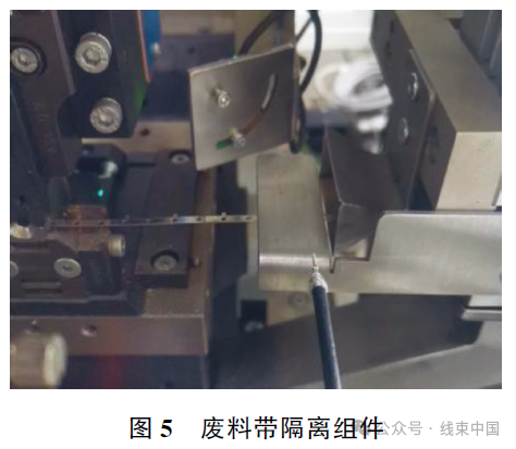 增加廢料帶隔離組件,如圖5所示,在雙端同時加工的自動化生產(chǎn)線上,通常情況下,先將左端的中心針穿外導(dǎo)體,然后壓接外導(dǎo)體,這個時候右端的中心針處于懸空狀態(tài)。當(dāng)左端壓接模組上的料帶切斷刀鈍了,無法正常切斷廢料帶,將導(dǎo)致多余的料帶向上弓起,如圖6所示,干涉線束右端的屏蔽絲,壓接設(shè)備后退時將已經(jīng)翻網(wǎng)徹底的屏蔽絲掛扯并拉到和中心針區(qū)域,當(dāng)右端穿外導(dǎo)體時,出現(xiàn)短路的不合格產(chǎn)品。因此,壓接左端外導(dǎo)體的壓接機模具的廢料帶一側(cè),必須增加一個廢料帶隔離板,將廢料帶和右端線纜完全隔離,避免產(chǎn)生嚴(yán)重的短路不合格品或有潛在質(zhì)量風(fēng)險的產(chǎn)品流出。